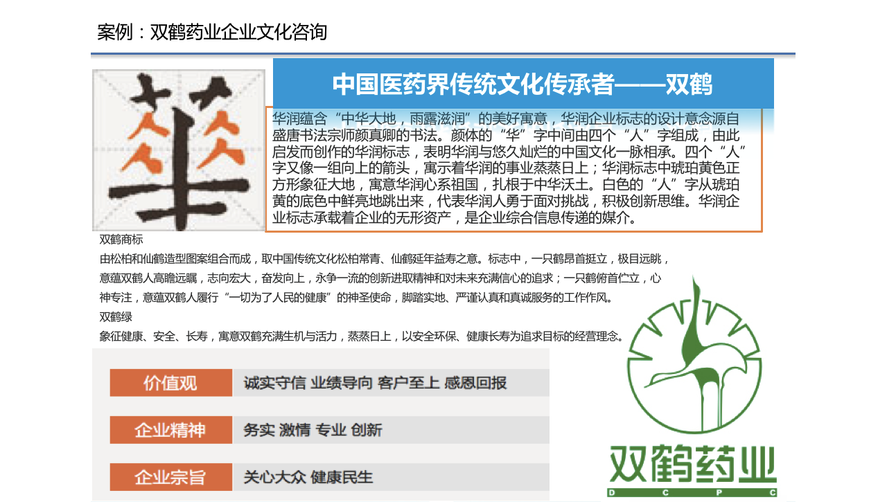【項目背景】北京雙鶴藥業(yè)股份有限公司(籌)的主要發(fā)起人是北京制藥廠。北京制藥廠1939年誕生于太行山革命根據(jù)地,現(xiàn)已發(fā)展成為中國大型綜合型 制藥骨干企業(yè),在全國醫(yī)藥行業(yè)有較高信譽。2006年,在雙鶴藥業(yè)企業(yè)文化創(chuàng)新發(fā)展的過程中,舊有思想觀念及新的價值取向仍有一股力量,將對文化發(fā)展構成較強的思想障礙,企業(yè)管理者高瞻遠矚清醒地正視這些發(fā)展中存在的問題,進一步轉變觀念,聘請精雕品牌進行全面企業(yè)文化咨詢項目,使得這個項目成果成為促進文化健康成長的基本前提。